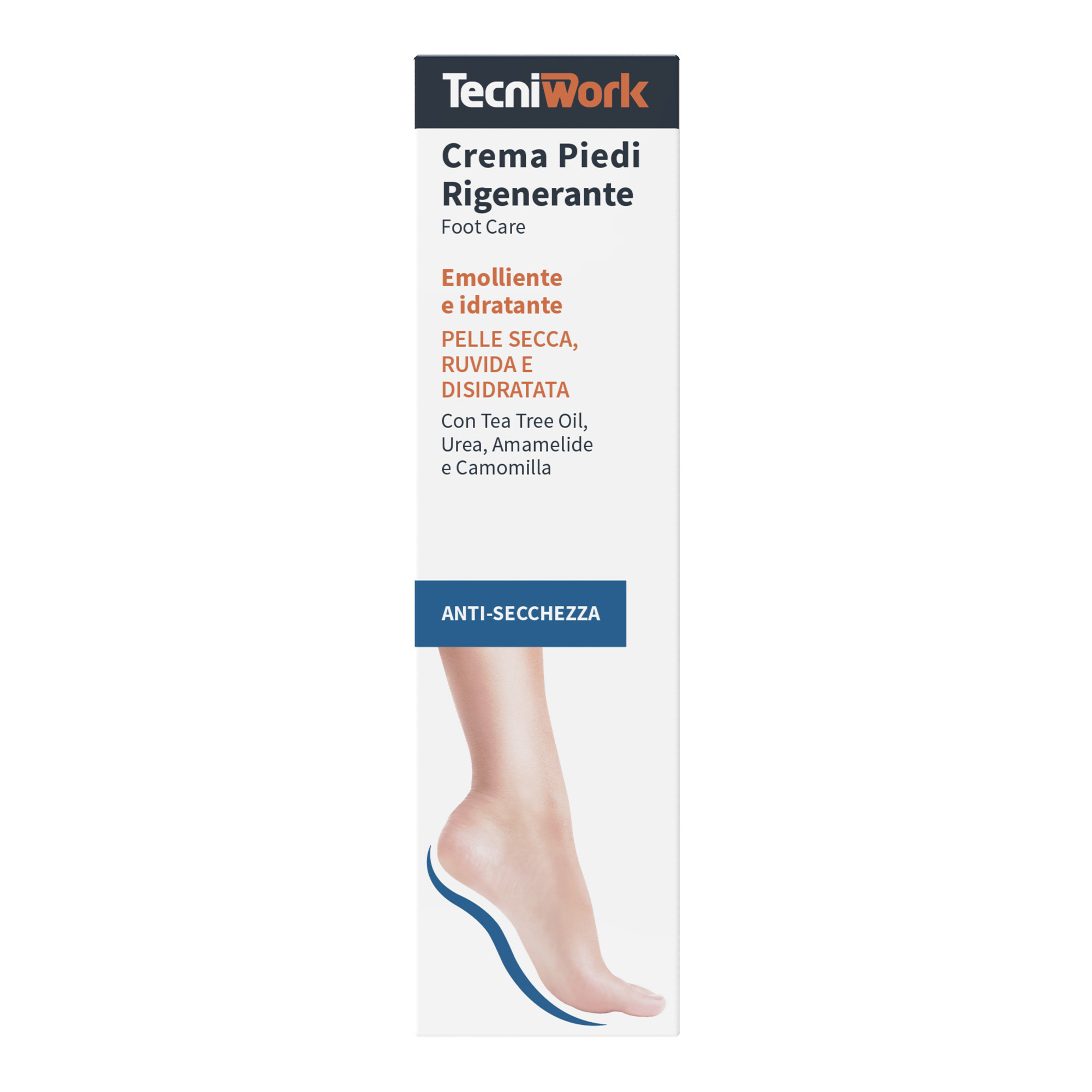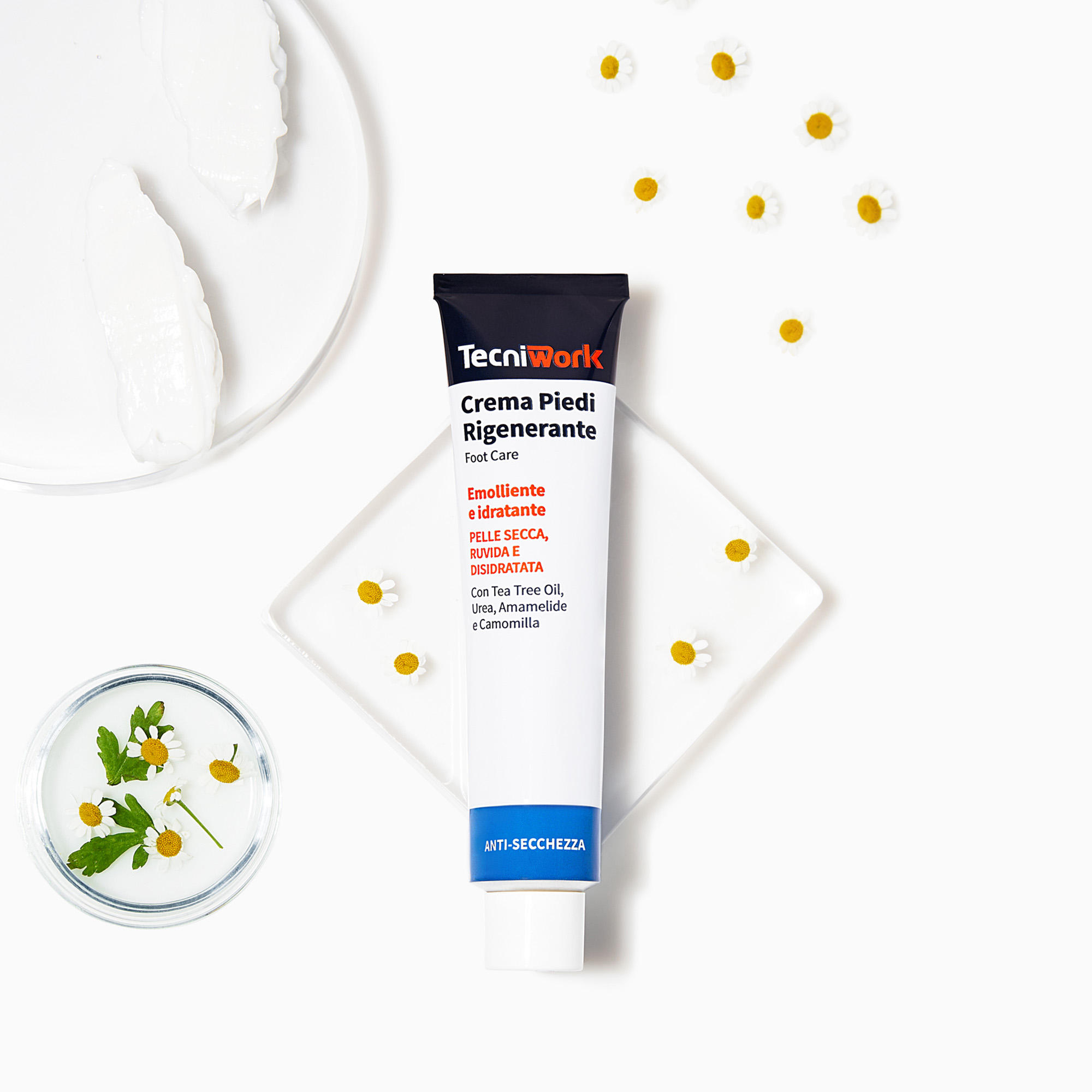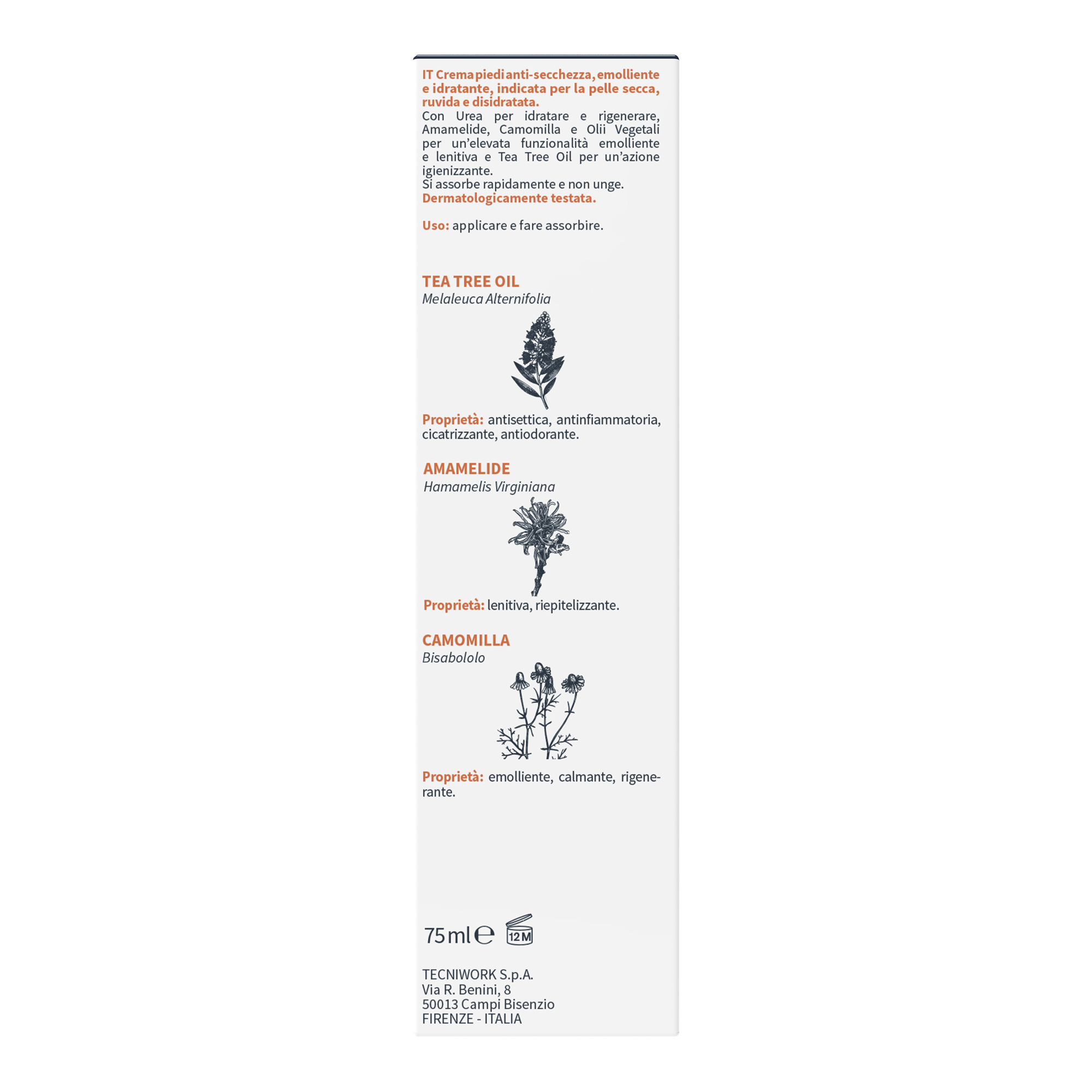 Crema idratante e rigenerante per piedi secchi con Tea Tree Oil, Urea, Camomilla e oli vegetali. Assorbimento rapido, azione anti-secchezza. 75 ml.