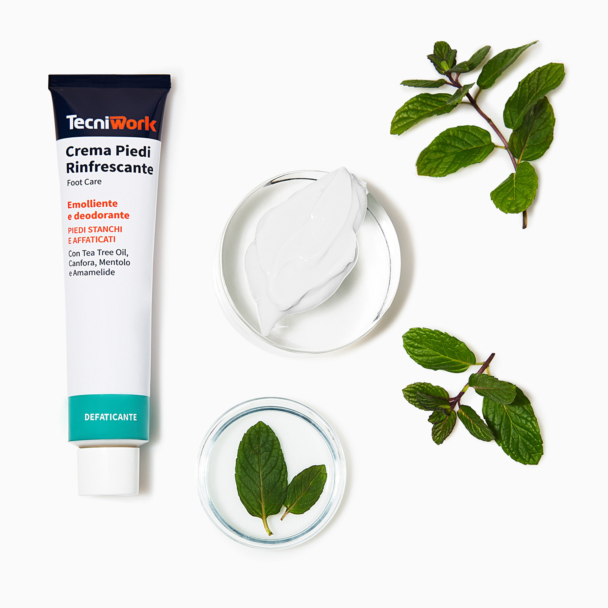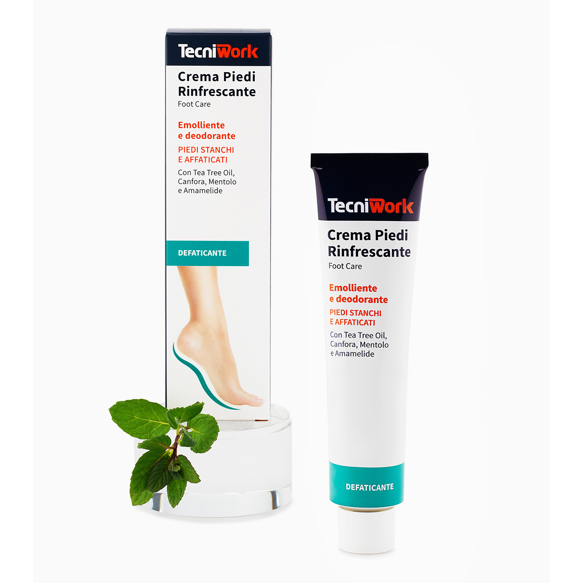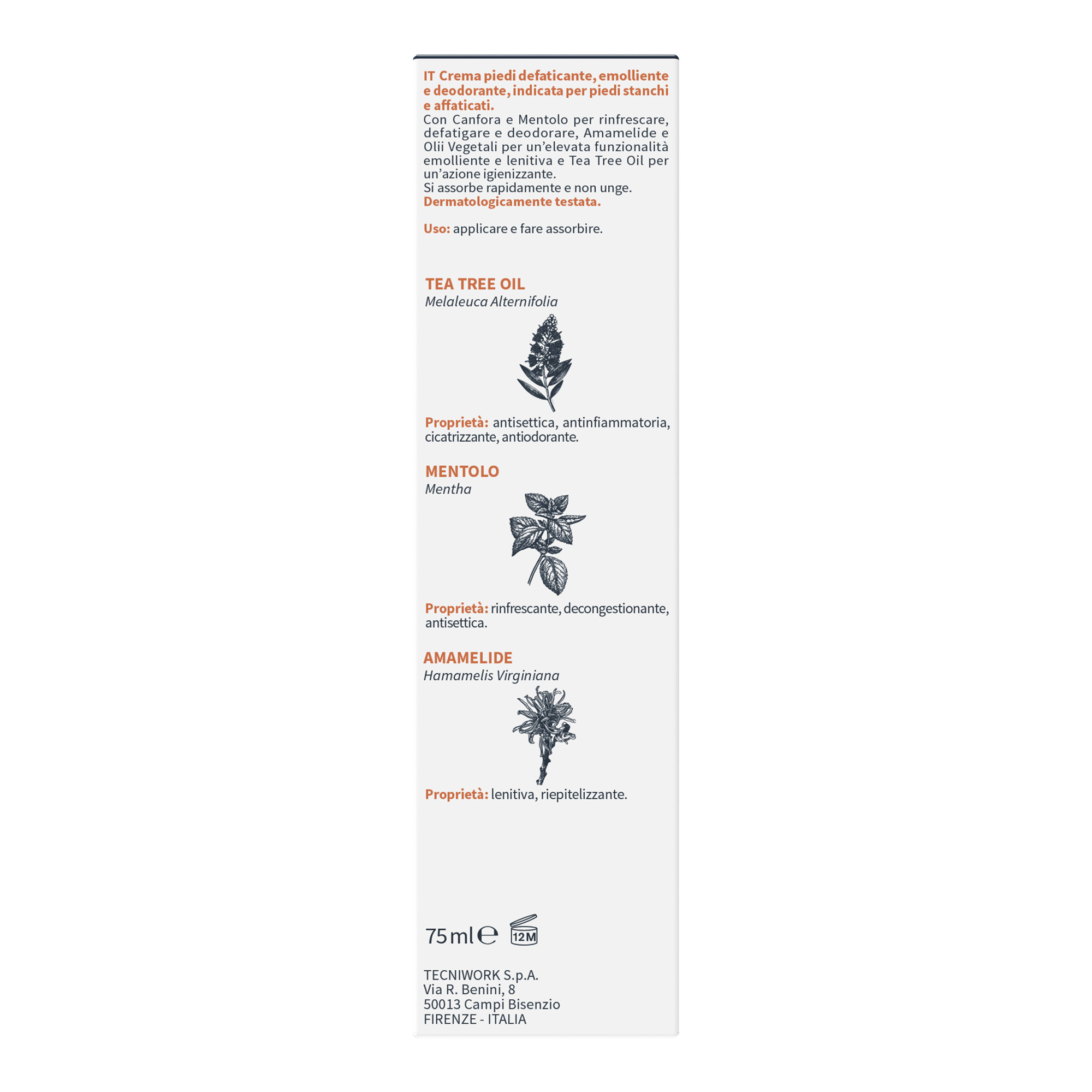 Crema rinfrescante per piedi stanchi con Tea Tree Oil, Mentolo e Canfora. Deodorante, emolliente e a rapido assorbimento. 75 ml.